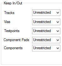 In the Keep In/Out dialog, you can defined Tracks, Vias, Testpoints, Components, Component Pads, as either: