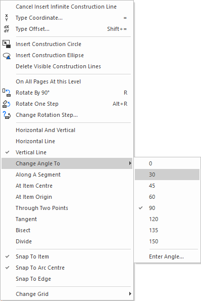 Use the Change Angle To sub-menu to alter the angle of the line currently being added. The menu shows all the thirty degree steps commonly used, or use the Enter Angle option to type the exact angle required. You can also set the construction line angle to match any straight line segment already in the design. Do this by using Ctrl Click on the existing segment. The moving line will change its angle to the selected segment, and if the segment was a construction line it will be highlighted and the status bar altered to show the distance from it.