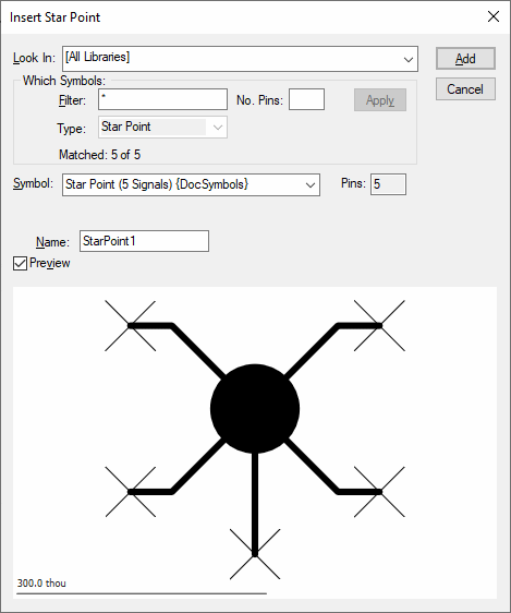 Use this option for adding a Star or Delta Point symbol to a Schematic or PCB design from a documentation symbol library. This is used to join two or more related nets together at a single point in the design at the same time leaving them separate in the netlist.