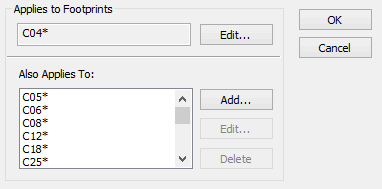 This section specifies the Footprint names to which this package will apply. The first name is the name by which the package will be listed in the Libraries dialog. The other list shows additional Footprint names to which this package will match. Any of these names may contain wildcards, as shown in the example below.