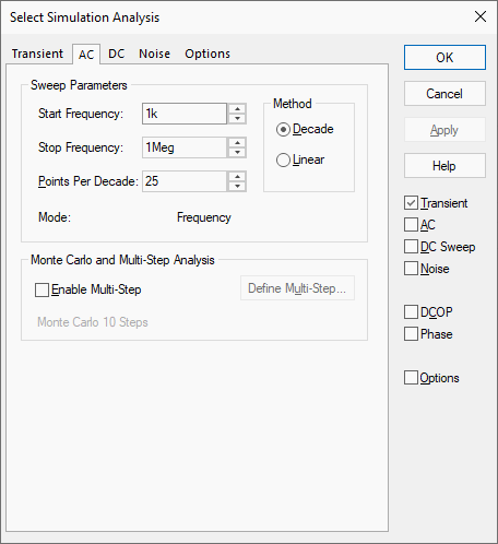 Like DC and Noise analyses, AC analysis is a swept mode and can operate in any of the 6 Sweep Modes. With some of these modes - e.g. sweeping a resistor value - it will be necessary for the DC operating point to be recalculated at each point while with others - such as frequency sweep - it is only necessary to calculate it at the start of the run.