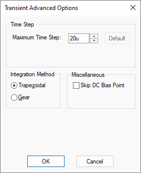 Always use Trapezoidal for resonant circuits and set this to Gear if you see an unexplained triangular ringing in the simulation results. If you experience repeated convergence failures, it’s also worth trying this option as with some designs it will improve the performance.