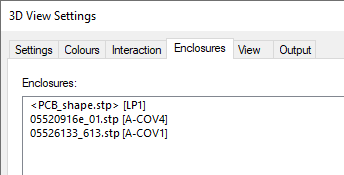 When viewing the 3D View Settings, Enclosures page, Components with the STEP Enclosure attribute assigned will be shown with the Component name next to each one in square brackets.