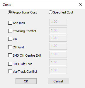 - Proportional Cost With this method you supply a multiplier to apply to the built in costs. So to make the cost (for example) of adding a via twice as much as it normally is you would supply a factor of 2.0 . If you are going to change the costs this is the recommended way.