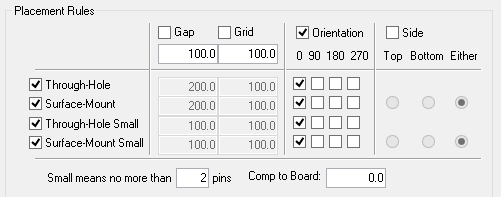 The controls in this section allow you to choose how each type of component is to be placed. For example, you could place your larger components on a larger grid (which will allow placement to run quicker), whilst allowing the gaps between the large components to be filled with smaller ones by giving those a smaller grid and/or gap, and perhaps allowing the smaller ones to be rotated.