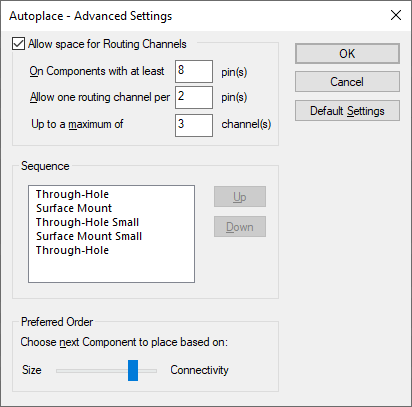 This list allows you to choose the order in which the different types of component are placed. Changing the order here will change the order of the ‘rows’ in the Placement Rules section of the main Autoplace dialog. Select an item and use the Up or Down buttons to change its position in the list.