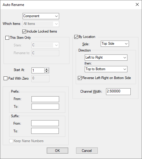 You can rename Components or Test Points by location by checking the By Location box. This enables you to produce a name sequence based on the physical location of these items on the board. This style of rename is commonly used for the service engineers convenience when attempting to diagnose problems on the board and using a schematic diagram as reference.