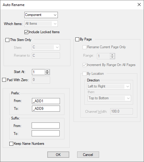 You can specify a Prefix or Suffix and you can change these strings From the specified value To a different one. For example, ‘U1\_ADD1’ with Suffix from ’\_ADD1’ to ’\_ADD2’ would give ‘U1\_ADD2’.