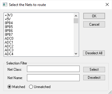 Use the Browse Nets dialog to select the Nets or Net Classes to autoroute. The parameters used for routing will be taken from the settings within the main Auto Router dialog.