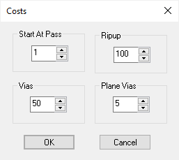 Costs will invoke the Costs option which can change the Cost Factors used by the autorouter. You can use this dialog to change the costs involved with ripping up existing tracks and inserting vias. You can also restart the Autorouter at a specified Pass.