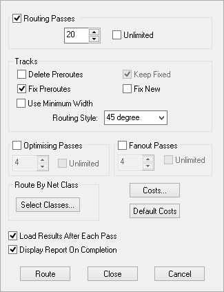 - Routing Passes This invokes a number of routing passes which will route either all nets in the design or the specified nets, depending on which option started this dialog.