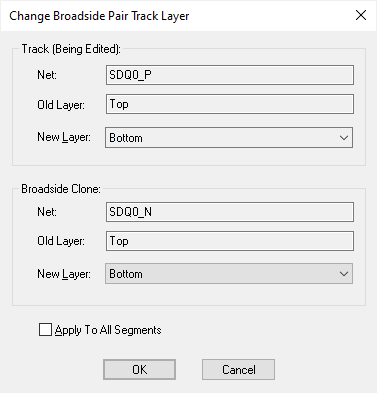 At the same time as changing the track layer, you can change the layer that the broadside clone track will be on. If you are currently adding paired segments you cannot set the two layers the same, but if you are not currently pairing, for example if you are mirroring the tracks, the layers can be the same so that you can connect both tracks to surface mount pads on the top or bottom side.