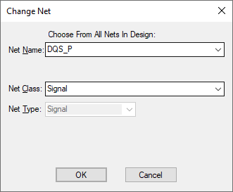 You can use the Change Net dialog to change the net class that the selected net uses. This can be changed by selecting a name from the list compiled from the Net Classes in the design’s Technology data.