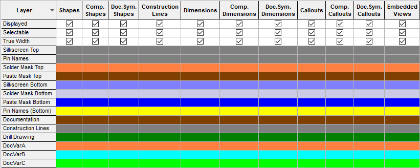 When a technology file is used with a footprint design, the component shape colour is transferred to the shape columns, because this is consistent with their final use in a PCB design. Similarly for Doc. Sym. Shape colours when editing a documentation symbol. The Comp. Shapes and Doc. Sym. Shapes columns are therefore not needed when editing a footprint or documentation symbol. The same is true for the Dimension and Callout columns.