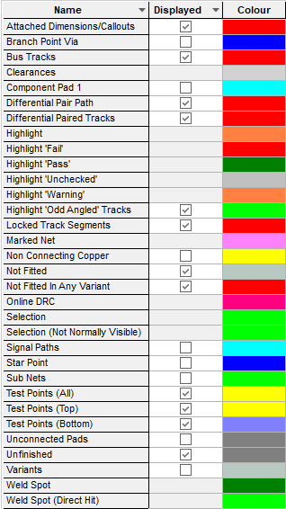 Colours - Overview | Marked Net | Online DRC | Insert Test Points | Variants | Differential Pairs | Signal Paths | Sub Nets