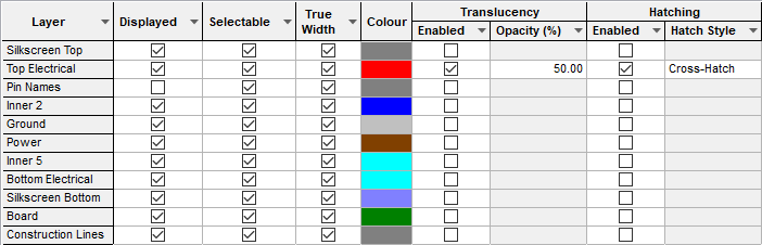 - Elec Shapes defines the visibility and colour of shapes on electrical layers, such as tracks, copper shapes, etc.