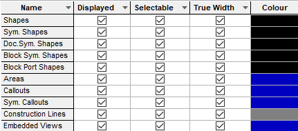 When a technology file is used with a symbol design, the symbol shapes colour is transferred to the shapes row, because this is consistent with their final use in a schematic design. Similarly for Doc. Sym. Shapes colours when editing a documentation symbol. The Sym. Shapes and Doc. Sym. Shapes rows are removed when editing a symbol. The same applies to Sym. Callouts.