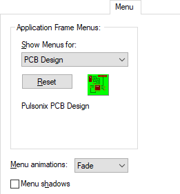 Show Menus for: allows the menus for a different type of design to be displayed allowing them to be customised.
