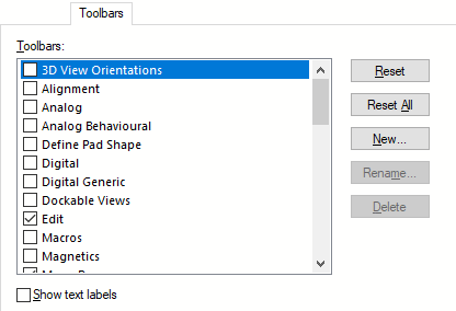 The Toolbars list displays all toolbars available for Pulsonix. This will be all standard built-in toolbars plus any custom toolbars that you have defined. Standard toolbars cannot be renamed or deleted from the list but can be disabled by unchecking the check box next to the name. Although all toolbars can be selected as enabled, they only appear in context. For example, if the Analog toolbar is selected in Customise in the PCB Design Editor, it will not appear in the Schematic Editor unless enabled in that application too.