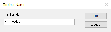 The Toolbar Name dialog appears when the New button on the Toolbars tab is selected. Enter the name of the new toolbar then press OK to confirm the creation of the toolbar. A new custom toolbar will appear, ‘floating’ over the application main window, ready to have your chosen commands dragged on to it. Alternatively, click Cancel to abort the creation of a new toolbar.