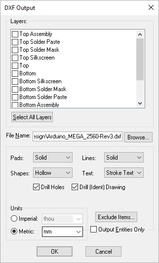 DXF Output saves all of the selected settings and layers to the registry for Schematics and PCBs. This means that in addition to saving the settings to the registry when outputting a DXF file via the Output menu, the settings can also be saved to the design through the CAM/Plot mechanism where the plot will keep track of the output settings.