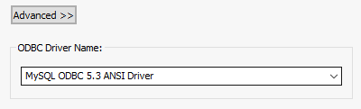 Clicking the Advanced>> button will extend the dialog to display a drop-down list showing all available ODBC Drivers currently installed on the system and allowing an alternative to be selected. Note that this list is NOT filtered on your chosen type of database and selecting a driver that is not compatible with your database type will result in a connection error.