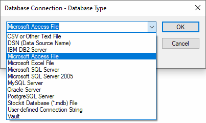 Use this dialog to choose the type of database you want to access. This dialog is accessed from the Database Connection Setup dialog.