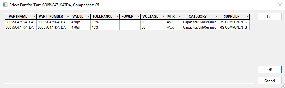 The Info button will display information about the Part, such as Name, Part Name, Footprint, Attributes etc.