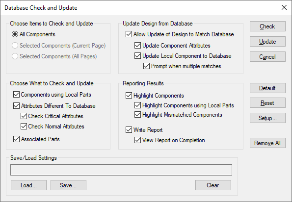 Checking the Allow Update of Design to Match Database option enables the Update button in addition to the Check button on the right hand side of the dialog. The Update Component Attributes and Update Local Components To Database options specific the type of updates to perform and are described in more detail in the Updating the Design to Match the Database section below.