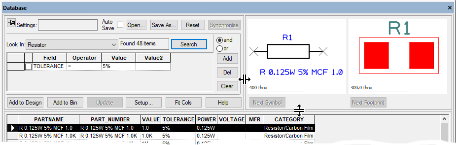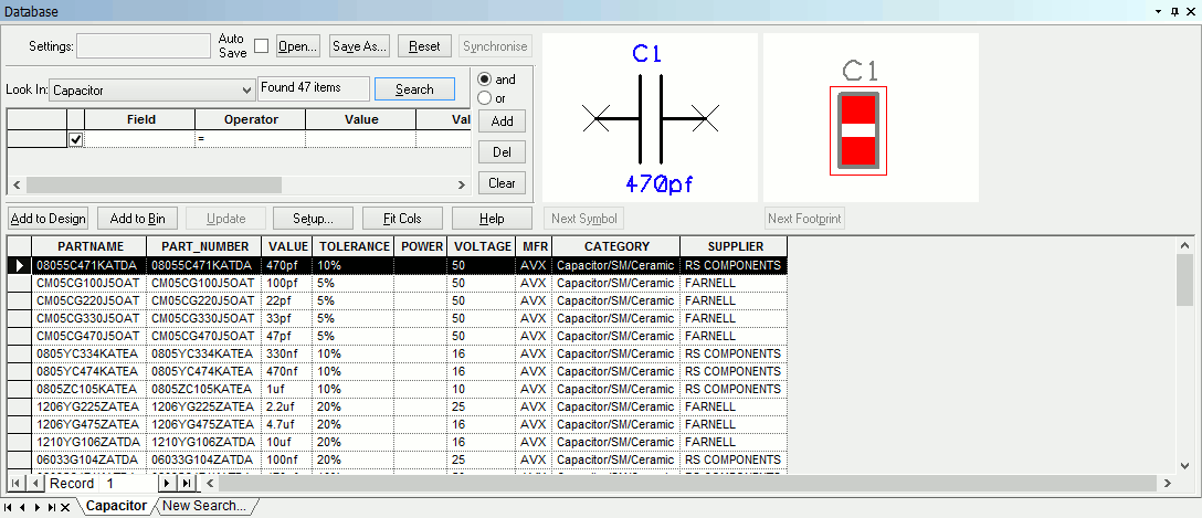 The Database Bar is a Dockable Window which allows you to do parametric searches of your component database to find the correct component to insert into your designs.