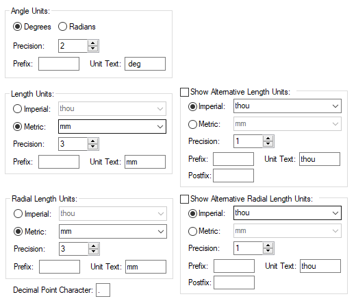 For both Length and Radial Length there is the option of including a second ‘alternative’ set of measurements in different units so that your dimensions display the measurements in two units. These alternative units are set up in the same way as the main units, with the addition of fields that let you control how the alternative units are separated from the main units or possibly enclosed in other delimiters to make them clear to read.