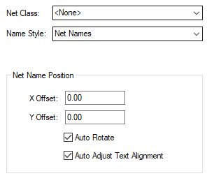 Use Auto Adjust Text Alignment to specify if the net name can have its Text Alignment altered to be at the corner of the name box that is closest to the pin or bus terminal. This has the advantage that if the net name is changed or its style is changed, its offset to the parent node is always kept the same.