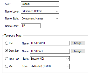 The Name Stem is the default name that the Testpoint Name will take when adding a new Testpoint to your design. Each Testpoint will have a unique Name, TP1, TP2 etc.