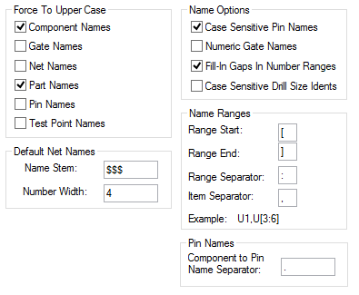 Checking the Fill In Gaps In Number Ranges box forces names for new Components, Test Points, Branch Points, and Star Points to fill in any gaps between name numbers before adding to the end of the number range. For example, if there are names ‘A1’ and ‘A3’, having this option checked will add ‘A2’ before adding ‘A4’.