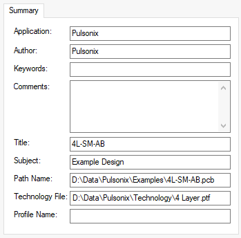 Title - The design title. Is available as a Pulsonix attribute, so can be used in the design. Also used in the Pulsonix reports headers.