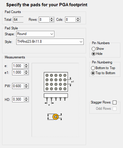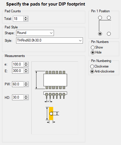 Generally, for all types, you specify pad sizes, pin numbering information such as the pin one position, whether pin numbers are to be shown and the direction in which the pin numbers will proceed.