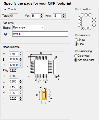 A QFP footprint had pads on four sides. The information you will need to specify includes the number of vertical and horizontal pads and values to define the vertical and horizontal row pitch as well as the pad pitch.