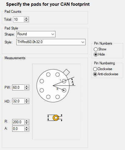 A CAN footprint consists of a circle of pads. The pads are equally spaced, so you only need to specify the radius of the circle. The position of Pin 1 is given by an angle (0 being centre right).