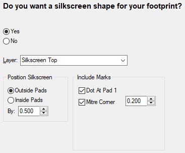 The picture below shows all the various controls for setting the Silkscreen parameters for a Footprint. Note that when using the Footprint Wizard not all the controls will be visible for all type of Footprints.