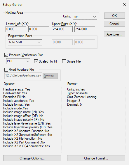 Gerber Apertures | Change Format | Change Gerber Options | Output CAM | Plot Settings