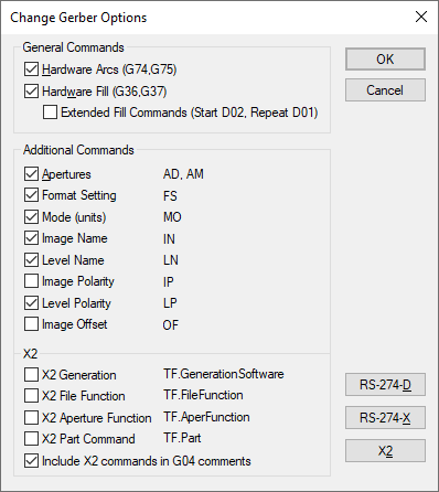 RS-274-D, RS-274-X and X2 : pressing one of these buttons will reset the Additional Command switches on this dialog to the state required to conform to these levels/revisions of the Gerber format definition.