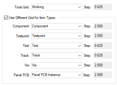 When this check box is selected, you can define the grid that specific design items will use - Component, Testpoint, Text, Track, Via and PCB Panel. For each selected grid, the Step value is displayed. Uncheck this option to just use a single grid for everything (Tools Grid).