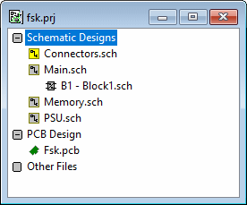 In this example, the project name is Project1 .prj with three schematic designs named page1.sch, page2.sch and page3.sch, which when translated to PCB, make one single PCB design named PCB design.pcb.
