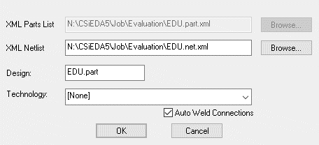 Part and Net information can be extracted from CSiEDA. It comprises of a parts file and a netlist file in XML format. This can be read into Pulsonix. This dialog is invoked when either the parts or netlist file is selected from the Open dialog.