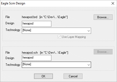 This dialog is used when when you are importing Eagle Designs. Because a lot of the part information is not held in the Eagle PCB Designs it is better if the PCB and Schematic are imported as a pair. If you select a brd or sch file it will guess an equivalent name for the sch or brd file. If this is not the name that you want you can browse for the wanted file. If the other file does not exist you can continue just importing the file you selected. You can also choose to use technology files to base the designs upon.
