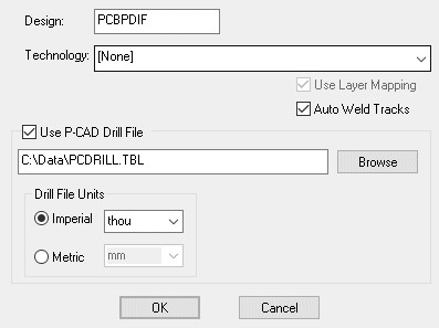 The PDIF format does not include drill hole data. The drill hole sizes are held in separate P-CAD/Master Designer files. If you have the appropriate drill file check Use P-CAD Drill File and you can select the file.