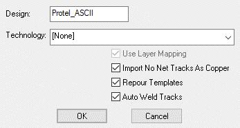 This dialog is used when when you are importing Protel or Altium Designer PCB designs. It enables to change the default name that you want the imported design to be called. You can also choose to use a technology file to base the design upon.