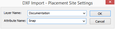When importing into a PCB design, it is possible to generate Placement Sites from ‘crosses’ in the DXF data. Placement Sites are attribute positions in the design, that can be used to ‘snap’ components onto particular locations on the board. If the Placement Sites checkbox is ticked, the design will be examined after import and any crosses (two single segment shapes of the same size that cross at 90 degrees to each other) will be marked with the specified attribute position at the point the lines cross. The layer to be checked for crosses, and the attribute name to use, are specified on the Placement Site Settings dialog. The attribute used should be added to the list of Placement Site attributes in Design Settings.