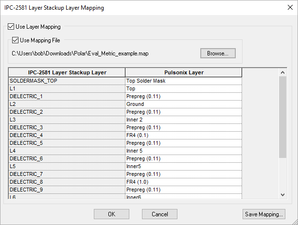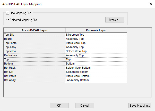 If no mapping file has been specified then the best approximation of the layer mapping is done. You can then change the mappings for each layer by selecting the Pulsonix layer from the drop down list in each cell.