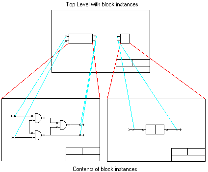 A block can be instanced in a schematic design (or another schematic block design). The symbol representing the block is placed in the circuit, and can be connected to, in a similar way to a component. However, as well as the symbol being added to the design, all the pages of the block design are also added. Component and net names are resolved so that there are no conflicts. Connecting to the symbol pins joins the nets with those defined in the block instance.